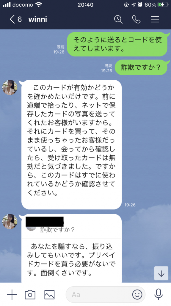 上記内容のLINEのやり取りをして、住所が家から600mの所でおかしいとは思ってたけど、2万円のカードを買えと指定され、電話に出ないし、途中からLINEの文章が男の口調になったり、明らかに不審だったから、警察に通報して帰った。