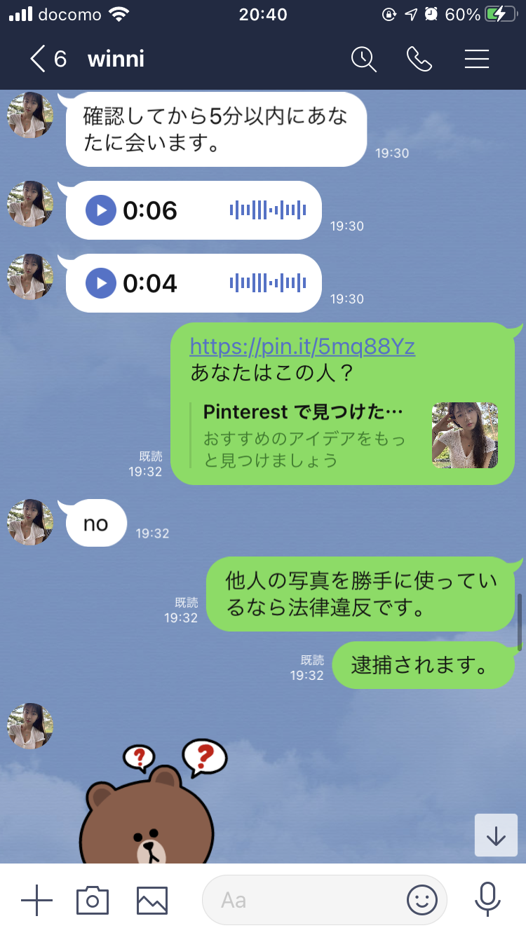TwitterでLINEID晒してくる留学生はほぼこのパターン。中の人が違うのか、画像は普通のから際どいのまで様々。通話すると、ボイメを繰り返し会話にならない。面白いからついつい知らない体でやり取りしてる。